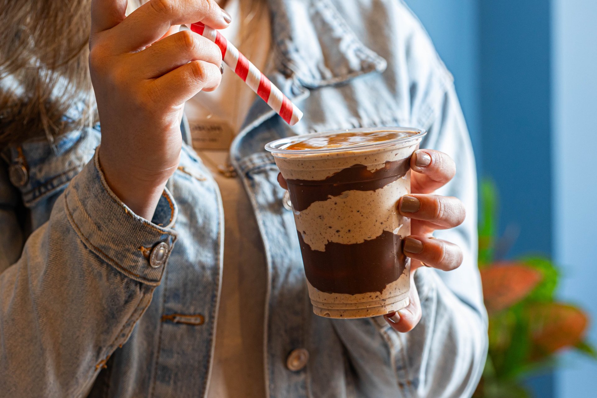 Escolha coberturas e recheios para deixar seu milkshake do seu jeito. Experiência personalizada do começo ao fim.