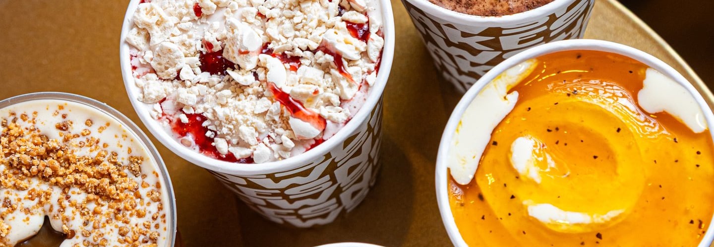 Escolha coberturas e recheios para deixar seu milkshake do seu jeito. Experiência personalizada do começo ao fim.